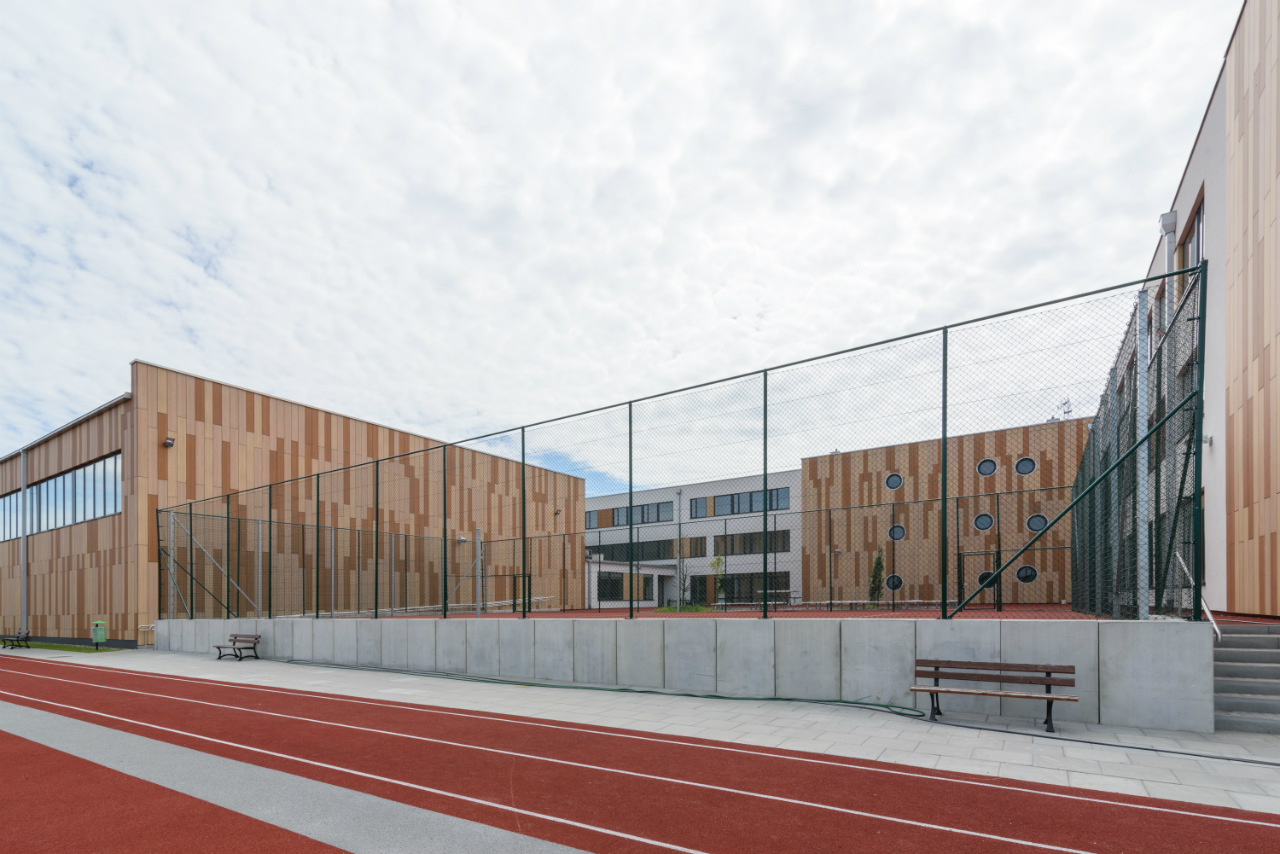 Architektura budynku bezpośrednio zainspirowana jest czystym modernizmem. Prostota układu, surowość prostopadłościennych brył, dominująca biel, szerokie pasy okienne, kompozycja czy wreszcie oszczędny detal mogą przywołać słuszne skojarzenia z architekturą Miesa Van der Rohe czy Le Corbusiera, choć oczywiście z pełnym zachowaniem proporcji wobec niedoścignionych Mistrzów. W odróżnieniu od pierwowzorów na elewacjach szkoły między oknami pojawiają się “docieplające” aplikacje w postaci paneli drewnianych, natomiast elewacje sali gimnastycznej wykończono tymi panelami w na całej powierzchni. Pojawiające się drewno wprowadza właściwą równowagę pomiędzy techniczną czystością bieli a naturalnością i swobodą, co pozwala odczytywać architekturę budynku gimnazjum jako grę, czy też starcie, porządku i wolności. Symbol trudnego czasu dojrzewania, kiedy uczeń z dziecka zamienia się powoli w osobę świadomą swoich wyborów. Choć trzeba sobie jasno powiedzieć, że architektura budynków z pewnością nie kształtuje charakterów, to na pewno można stwierdzić, że estetyczna i skromna forma i czytelne, dobrze zaprojektowane funkcje obiektu przynajmniej nie powinny w rozwoju człowieka przeszkadzać.